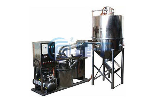 本机工作原理和传统中医研船,脚踏碾轮粉碎原理相同。碾轮在轨道上圆周滚动,加上适当压力,在反复碾轧的过程中使物料粉碎并达到需要的细度。由于碾轮双边刃口有剪切作用,也协同粉碎,特别是纤维性物料。粉碎过程中细的物料飘浮起来被风机吸入,排到旋风集料罐,布袋排出气体,成品料粉留在袋内。