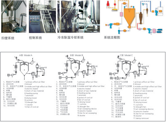 该机采用全封闭形式,所有部件均采用不锈钢制造,配有三级净化装置,过滤后的空气达十万级要求 。简体与顶部装有冷壁装置,使壁温<80℃,物料在壁上停留也不焦化变质现象,大大增加了收粉率(达95%以上),而且不会产生混药现象和粘壁现象。