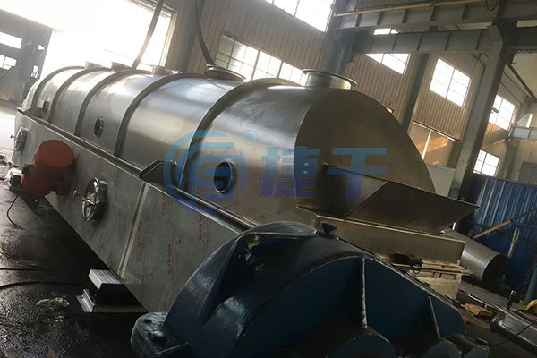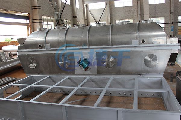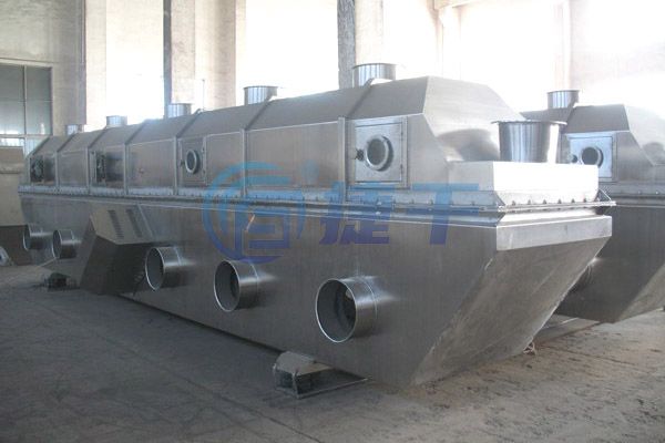 物料自进料口进入机内,在振动力作用下,物料沿水平流化床抛掷,向前连续运动,热风向上穿过流化床同湿物料换热后,湿空气经旋风分离器除尘后由排风口排出,干燥物料由排料口排出。