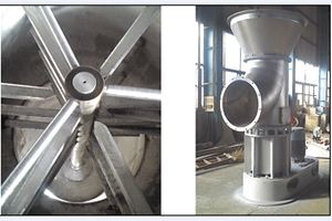 底部强化器设计独特,搅拌齿为菱形,其流线性能使风阻达到低,设置在圆锥形料斗内,分动刀和定刀,粉碎效果显著,使下落的结块物料迅速粉碎为适合气流干燥的粉粒料,搅拌的另一个主要作用是分散物料,加大了与料斗下面进来的高速热风的接触面积,于是料斗区形成了一个强烈传热传质的流化床,大部分湿分在料斗区燥。随着干燥的进行,变轻变细的干料受气流作用明显,与气流一起上升并进一步干燥,然后从干燥塔顶部出来进入物料收集系统。