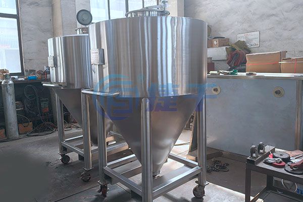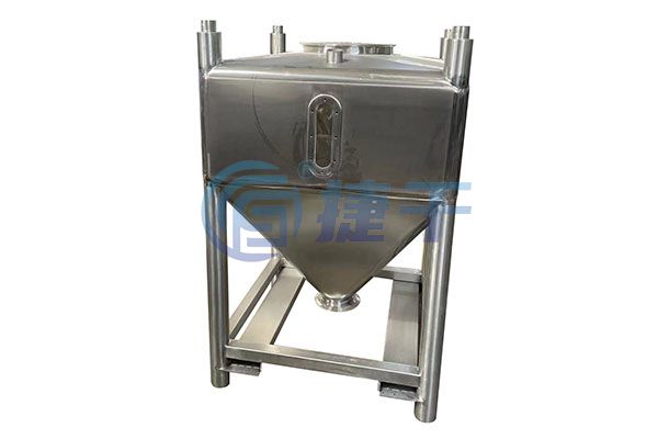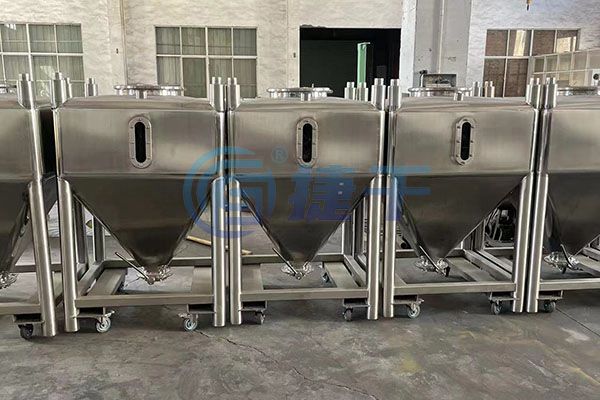 配快开式卡箍密封斗盖,4只PU脚轮不磨损地面,移动轻便噪音低,内表面镜面抛光无清理死角,大锥底设计+大口径粉体出料阀(或配真空出料器出料),排料顺畅。
