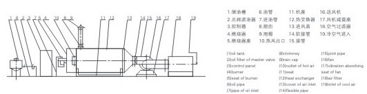 燃料通过燃烧器燃烧,产生高温燃气。并借助具有强化换热措施的热风炉将高温燃气的热量传导给被加热的空气,高温燃气经热量散发后温度降低至250℃后排到大气中。需加热的空气通过选配的鼓风机强送入热风炉,吸热后温度升至额定值从热风出口处送出,当热风温度达到额定温度上限时,燃烧器会自动停止燃烧或自动转为小火焰燃烧,当热风温度降低到额定下限温度时,燃烧器又会重新点燃运行或转为大火燃烧,升温的速度可以调节进风阀的开度来实现。